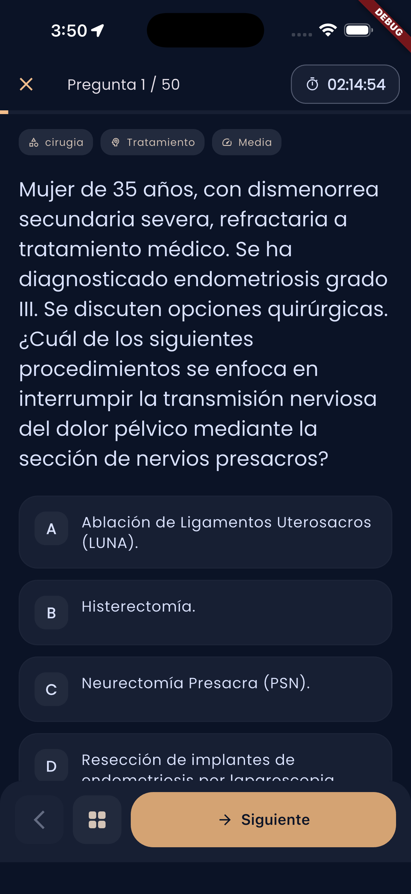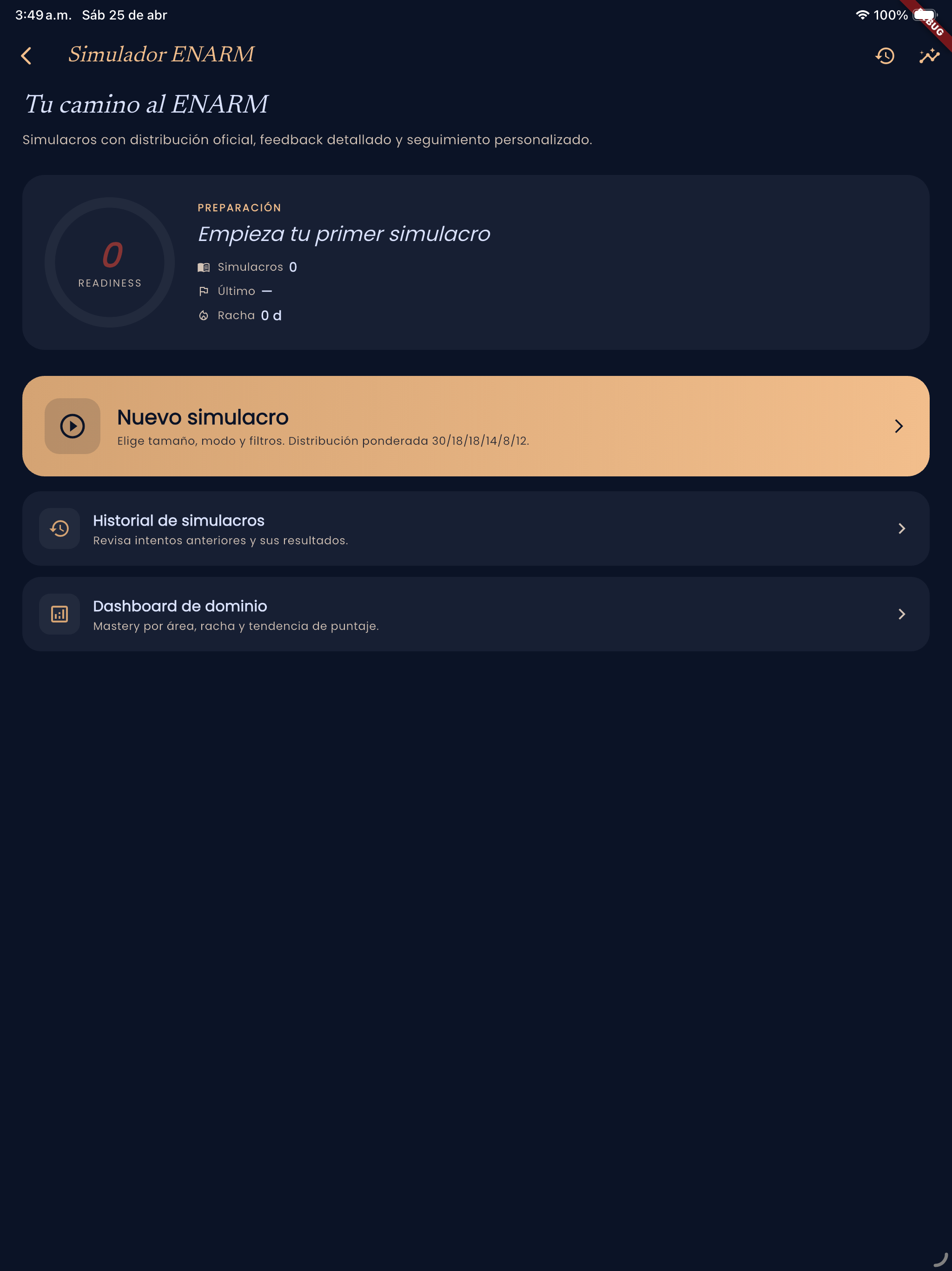 No es una app genérica de estudio. Cada función está construida para el tipo de razonamiento que el ENARM evalúa — desde el banco de preguntas hasta el simulador cronometrado.