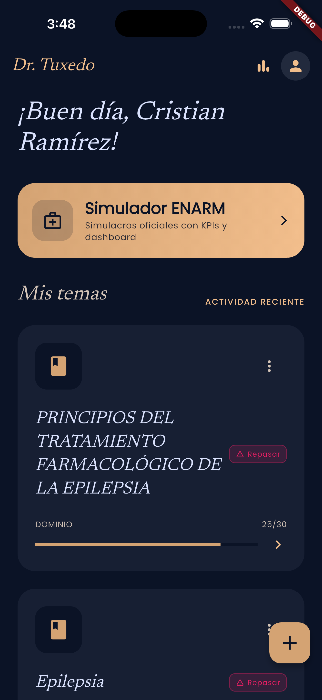 Dr. Tuxedo es la app de preparación para el Examen Nacional de Aspirantes a Residencias Médicas. Banco de preguntas razonadas, simulacros cronometrados y casos clínicos — diseñada para estudiantes de medicina y médicos en proceso de especialización.